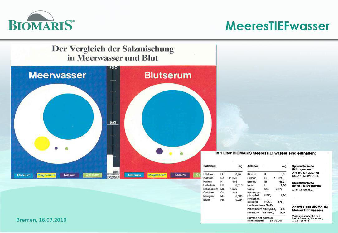 Εννέα (9) στοιχεία, μαζί με νερό και νάτριο, σχηματίζουν κατά 99% το ανθρώπινο σώμα και το διατηρούν σε λειτουργία. Εκτός από αυτά, υπάρχουν πολυάριθμα ακόμη στοιχεία και ιχνοστοιχεία, αναγκαία για τη δομή και λειτουργία του σώματος. Το εντυπωσιακό σε αυτά είναι ότι το θαλάσσιο νερό κι ο ανθρώπινος ορός αίματος μοιάζουν εκπληκτικά στη σύνθεσή τους. Αυτή η συμβίωση ανάμεσα στη θάλασσα και το πλάσμα του αίματος έδωσε στην Ιατρική απεριόριστες δυνατότητες.