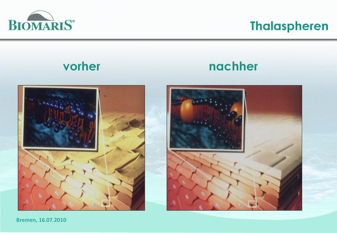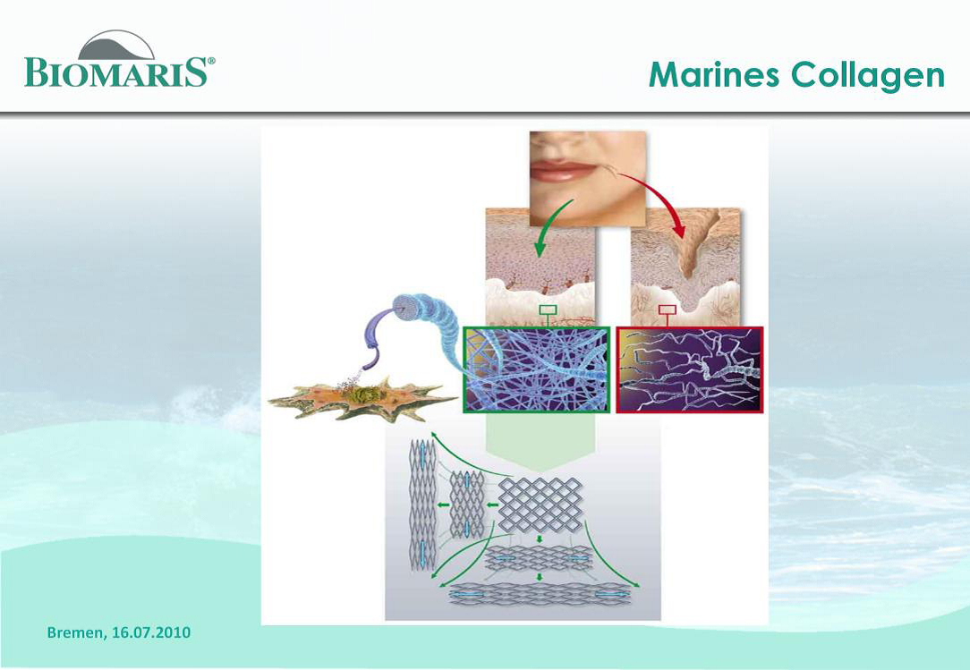 Μέσα σε προϊόντα της Biomaris, θα βρείτε μικρά μπλε σφαιρίδια, τα οποία είναι υψηλής τεχνολογίας θαλάσσια προϊόντα. Αποτελούνται από δύο στοιχεία: το θαλάσσιο κολλαγόνο και το Chondroitinsulfat, το οποίο είναι ένα εξειδικευμένο στοιχείο του συνδετικού και στηρικτικού ιστού. Τα μικρά αυτά σφαιρίδια αφομοιώνονται εύκολα από το δέρμα μέσω των επιθηλιακών κυττάρων και απορροφώνται σε πολύ μεγάλο βάθος όπου και δρουν. Το περίγραμμα του δέρματος εξομαλύνεται και η ικανότητα του να συγκρατεί νερό αυξάνεται. Αποτέλεσμα: το δέρμα γίνεται πιο φρέσκο, απαλό και σφριγηλό.
